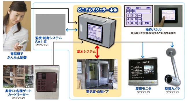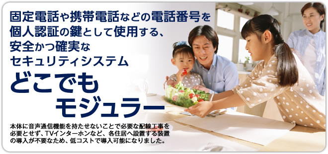 顧客からの要求が高い「複雑な操作は不要」をキーワードに仕様検討を重ね、オートロックを解錠するために宅内インターホンが必要であるという固定概念を打ち破り電話回線で制御する事で、従来のオートロック解除装置とは違い、本体に音声通信機能を持たせないことで必要な配線工事を必要とせず、TVインターホンなど、各住居へ設置する装置の導入が不要なため、低コストで導入可能。さらに簡単な操作でパソコン等の準備も必要ない、どこでもモジュラー が完成しました。