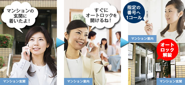 来訪者は居住者の携帯もしくは固定電話へかけ、解錠を依頼。居住者は登録済み電話で「どこでもモジュラー」に1コール電話をかけるだけで解錠が可能。(電話代はかかりません)