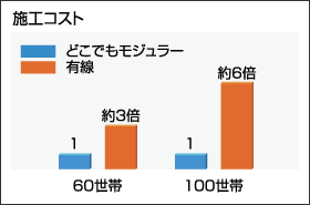 既存マンションへの配線工事は大変ですが、新築マンションでも配線工事はコスト高の要因となっています。どこでもモジュラー なら、約1/3のコストでオートロック解錠が可能になります。(施コストは当社調べ)