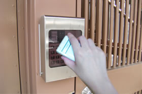 複数の出入り口がある場合、正面玄関に どこでもモジュラー と非接触ICカードリーダーを設置し、オートロック解錠機能り利便性を両立させます。その他の出入り口は非接触ICカードのみとし、監視カメラとの連動でセキュリティを向上させます。 また、長期間利用されていない施錠用の電話番号などを自動的に削除したり、解錠可能期間を設定する事で、管理が容易となります。